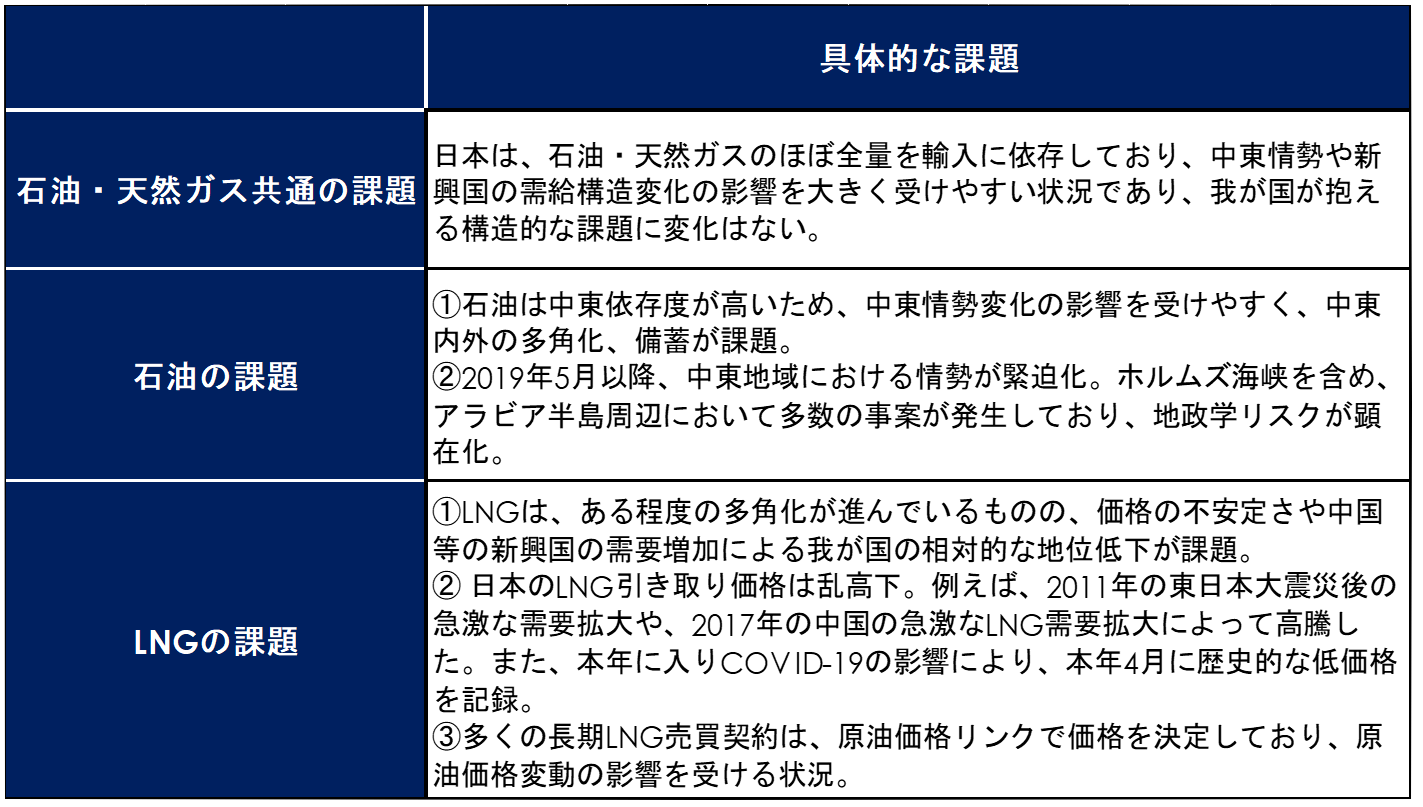 2020年1月以降、コロナ拡大に端を発した油価低迷や世界的な化石燃料からのダイベストメントの加速化による上流投資の減少及び将来的な需給逼迫リスクの増大、中国やインド等の新興国の石油・天然ガス需要の増加に伴うわが国のマーケットにおける相対的な地位低下など、いままでは想定していなかった外的要因が生じ、石油・天然ガスの安定供給確保に向けた不安要素となっていること。