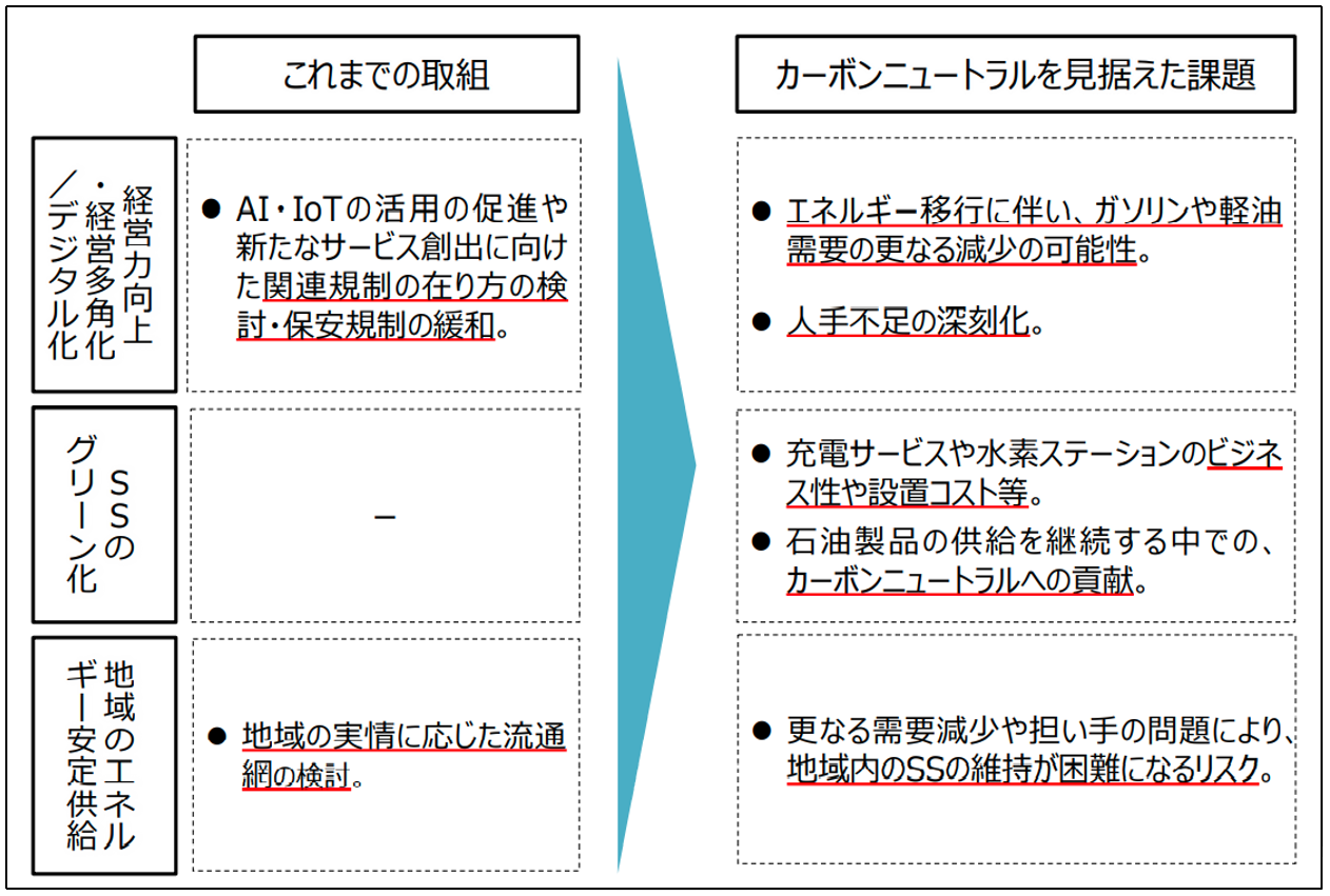 製油所やSSのグリーン化等で、従来の省エネだけではない取組みを進める必要、発電サービスや水素ステーションのビジネス性や設置コストなど、石油製品の供給を継続する中でのCNへの貢献、さらなる需要減少や担い手の問題により、地域内のSSの維持が困難になるリスクなどの課題。