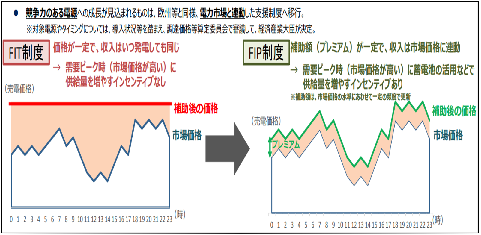 再エネの中でも競争力があり量的にも期待される風力発電や太陽光発電等については、これまでのFIT制度からFIP制度に移行することが予定されています。